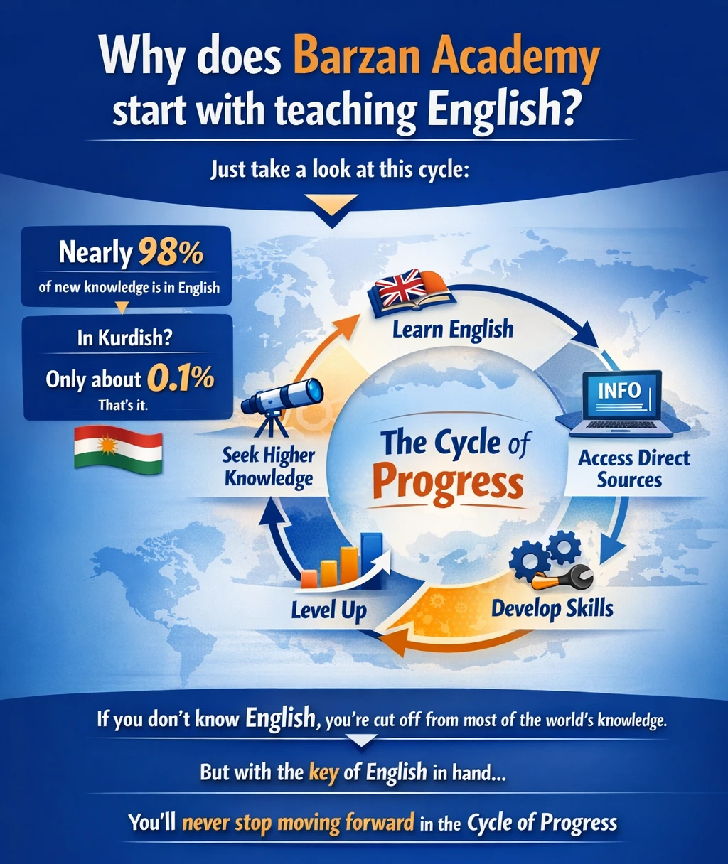 Barzan Academy is proud to present a specially chosen YouTube English course taught in Kurdish, designed to make learning English easier and more effective. This 50-hour program covers reading, writing, listening, and speaking skills, making it perfect for learners at any level.